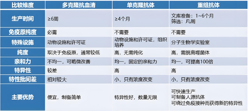 在特定應(yīng)用中,抗體的選擇需要考慮多種因素,如特異性和親和力水平、制備難易程度、設(shè)備要求、所需時(shí)間和費(fèi)用等。從多個(gè)維度對(duì)多克隆抗體、單克隆抗體和重組抗體進(jìn)行了比較,可以根據(jù)需要以此為參照,選擇合適的抗體類型。